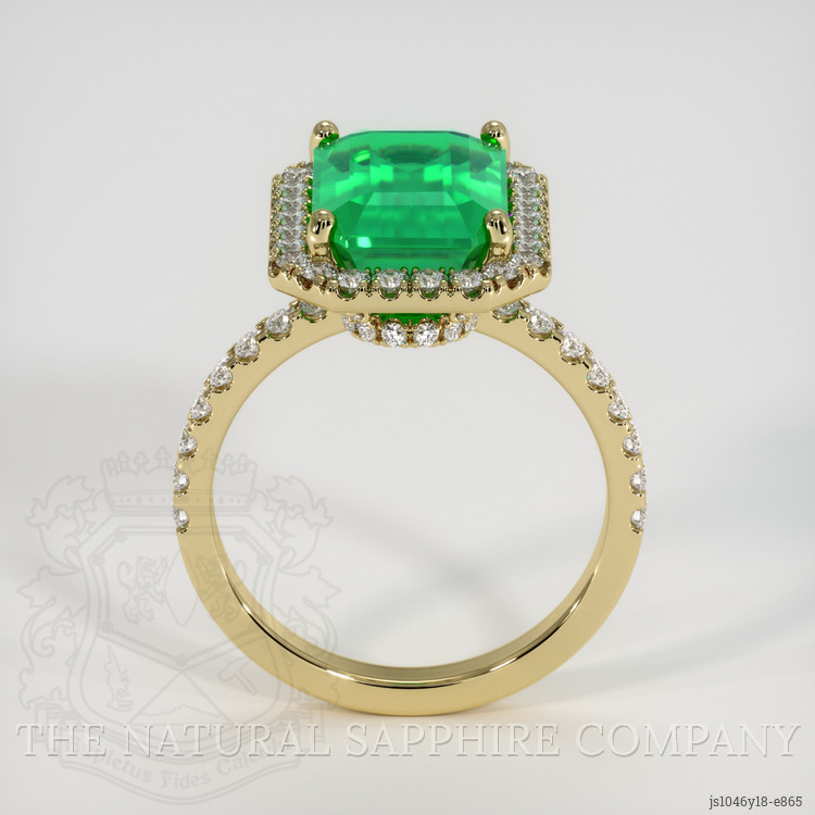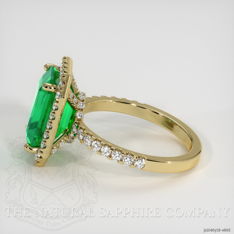 Crafted entirely from luxurious 18K yellow gold, the setting offers a rich canvas that accentuates the charm of both the emerald and its surrounding diamonds. The warm tones of the yellow gold provide an opulent backdrop that elevates the gem, making it the focal point of an exquisite story told through light and color. Each element of the ring has been expertly balanced and arranged to guarantee the emerald remains at the heart of this enchanting narrative.