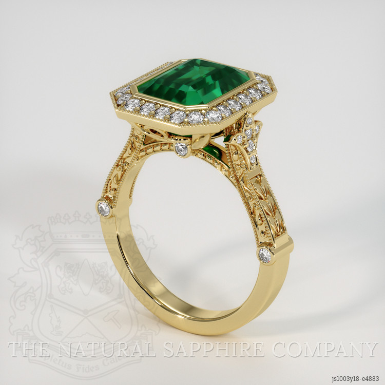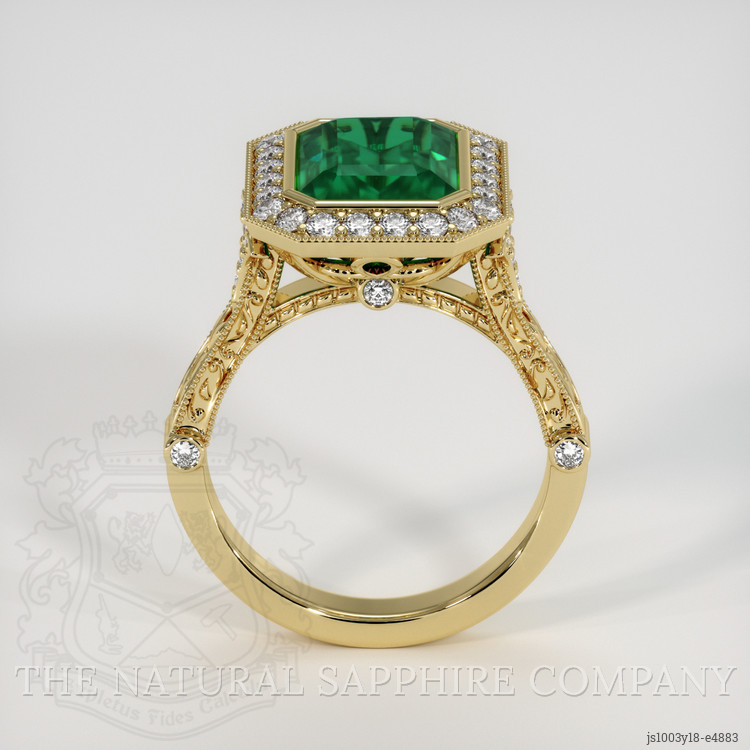 Beyond the center stone, the setting and the ancillary diamonds are executed to complement and amplify the faceting precision of the emerald rather than compete with it. The halo of F G color, VS clarity round diamonds is calibrated in size and spacing to produce a crisp white frame that increases perceived contrast, making the green center look richer and more vivid. The smaller accent diamonds along the shoulders follow the same grading and are set with exacting uniformity so that their brilliancy reads as a smooth continuum around the halo and along the band. In comparison to simpler settings that use inconsistent diamond grades or poorly matched stones, this composition creates balance, ensuring that the precise step facets of the emerald remain the visual anchor. The choice of 18 karat yellow gold also plays a deliberate optical role, because warm gold tones harmonize with green and deepen the hue in ways that platinum or white gold cannot, a nuance that experienced collectors and designers seek when wanting to emphasize color rather than sheer brilliance.