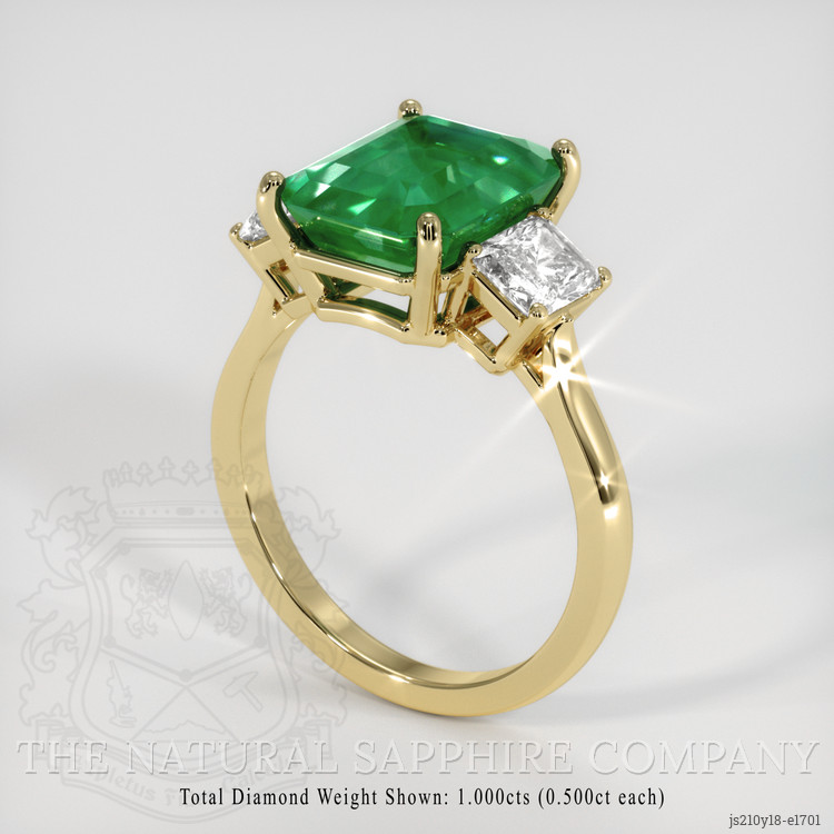 The ring features a beautiful, semi-transparent 3.70 carat emerald cut shape green emerald with the dimensions of 10.74 x 8.66 x 5.96 mm and a emerald cut. It has a clarity grade of slightly included (evaluated at eye level), vivid color saturation, and an excellent polish. The origin of this emerald is Colombia.