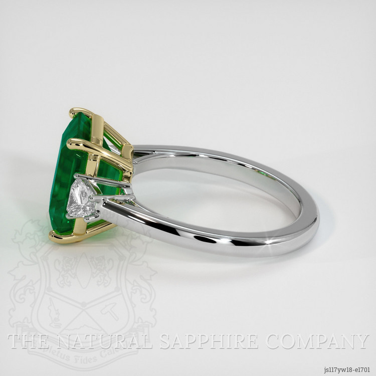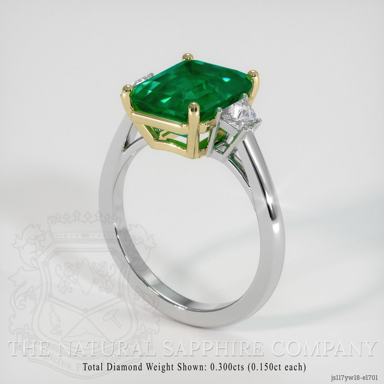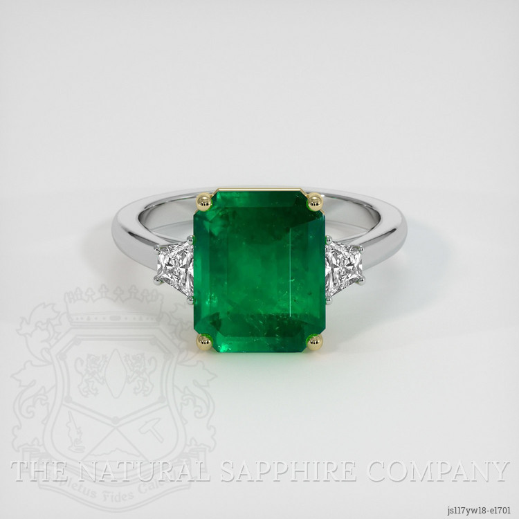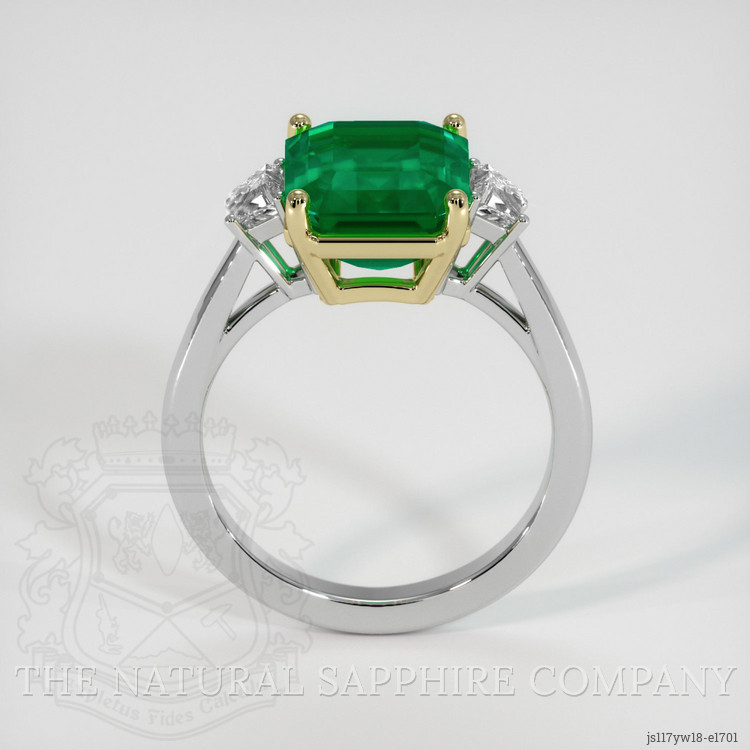 The ring features a beautiful, semi-transparent 3.70 carat emerald cut shape green emerald with the dimensions of 10.74 x 8.66 x 5.96 mm and a emerald cut. It has a clarity grade of slightly included (evaluated at eye level), vivid color saturation, and an excellent polish. The origin of this emerald is Colombia.