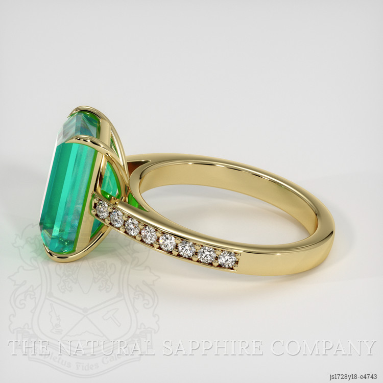 Our master artisans have set this extraordinary emerald in a sleek and sophisticated 18K yellow gold band, lending warmth and richness to its already vibrant glow. Surrounding this enchanting center stone are white round-shaped natural diamonds, weighing approximately 0.40 carats. With a clarity grade of VS and a color grade of F/G, these diamonds shine brilliantly, enhancing the emerald's natural beauty and embodying the purity and brilliance of everlasting love. Their strategic placement amplifies the emerald's allure, creating a harmonious marriage of stone and metal.