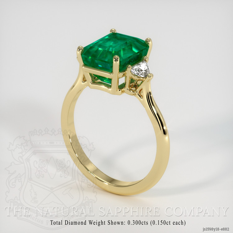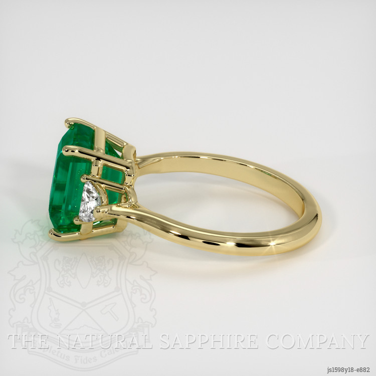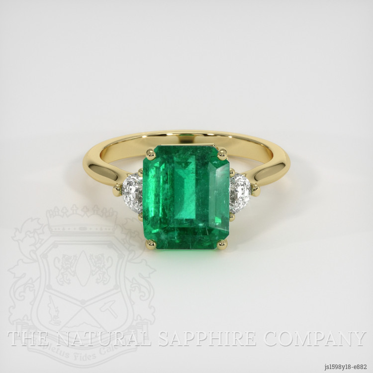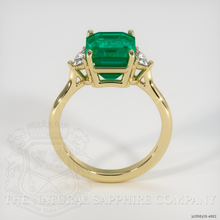 This emerald is elegantly set in a classic 18K Yellow Gold ring, style number JS1598, with a design that forgoes additional sidestones, allowing the emerald to shine as the unchallenged centerpiece. The ring features two diamonds, each weighing 0.15 carats, with an E color grade that signifies a rare white hue and a clarity of very slightly included (VS1, VS2), ensuring that the emerald’s radiance is complemented with the utmost brilliance.