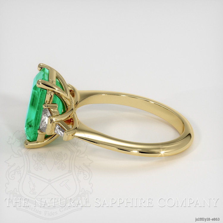 The ring features a beautiful, transparent 3.76 carat emerald cut shape green emerald with the dimensions of 11.16 x 7.99 x 6.10 mm and a emerald cut. It has a clarity grade of very slightly included (evaluated at eye level), medium color saturation, and an excellent polish. The origin of this emerald is Ethiopia.