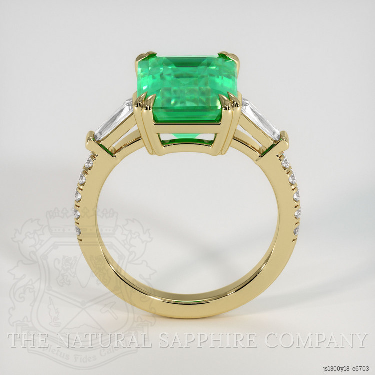 Flanking the vibrant emerald are pristine white baguette-shaped diamonds, weighing approximately 0.34 carats. The diamonds are of exquisite E color grade and bear a clarity that sails smoothly between the VS1 and VS2 grades. This impeccable combination enriches the emerald's resplendence while maintaining a delicate balance, exuding an aura of sophistication that is both modern and timeless. The tapered design further accentuates the central emerald, drawing the eye along the contours of bare refinement.