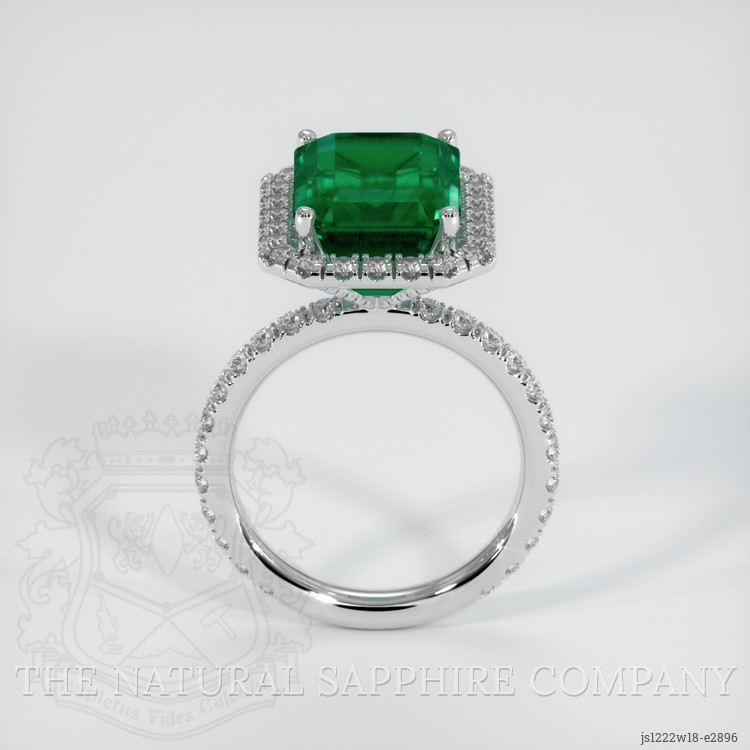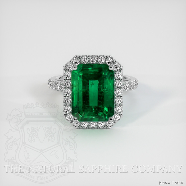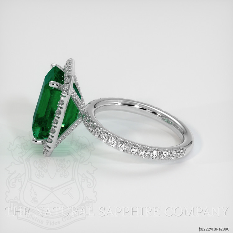 The ring features a beautiful, transparent 4.55 carat emerald cut shape green emerald with the dimensions of 11.23 x 8.31 x 6.55 mm and a emerald cut. It has a clarity grade of very slightly included (evaluated at eye level), vivid color saturation, and an excellent polish. The origin of this emerald is Zambia.