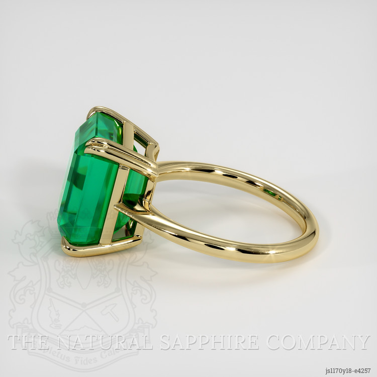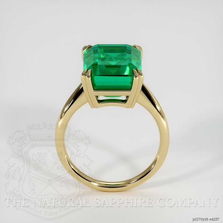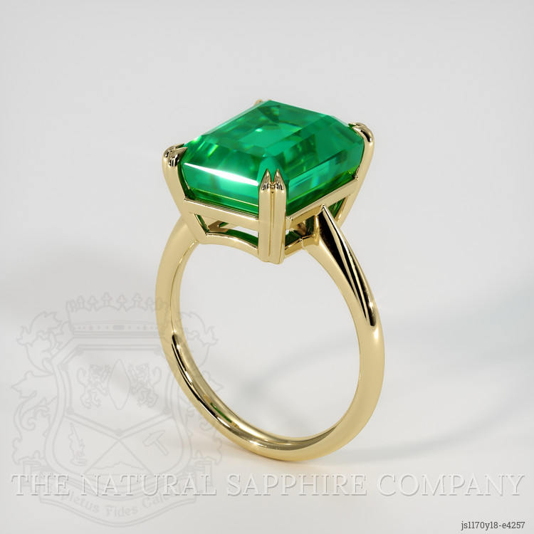 The majestic gemstone is set in meticulously crafted 18K yellow gold, known for its durability and rich color. This setting not only complements the emerald, enhancing its green tones, but also provides a luxurious backdrop that underscores the overall elegance of the piece. The ring’s design embodies versatility, intended to be worn as a standalone piece that commands attention, or stacked with other fine rings to create a personalized, layered aesthetic.
