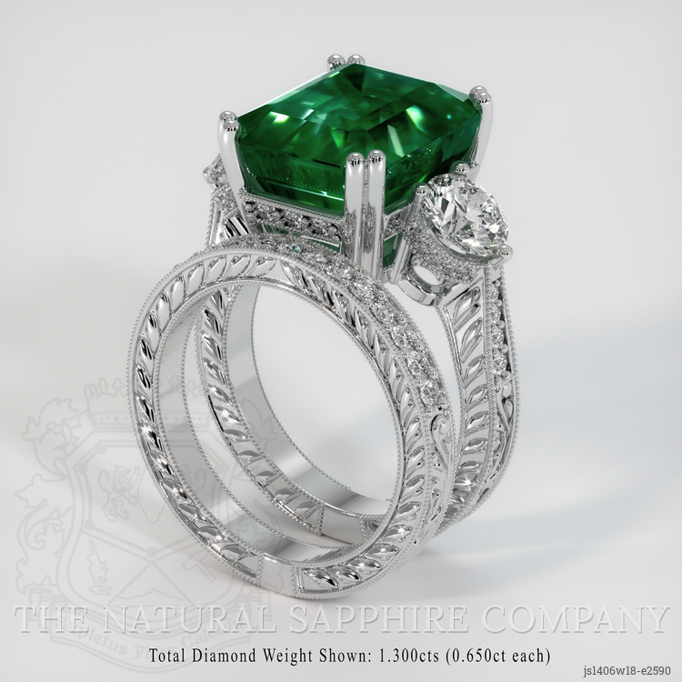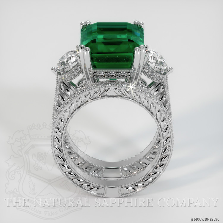Cradled in a luxurious 18K White Gold setting, reference JS1406, the emerald is the jewel in the crown, its substantial size making a statement of opulence and prestige. The ring features a double ball prong type, a design choice that adds a unique character to the overall silhouette of the piece. Accentuating the emerald's grandeur are the carefully selected sidestones and pave diamonds, each chosen for their ability to complement without overshadowing the central stone. Side position A hosts two diamonds, each weighing 0.65 carats, with an E grade color and a clarity of very slightly included (VS1, VS2), their brilliance underscoring the emerald's vibrancy.