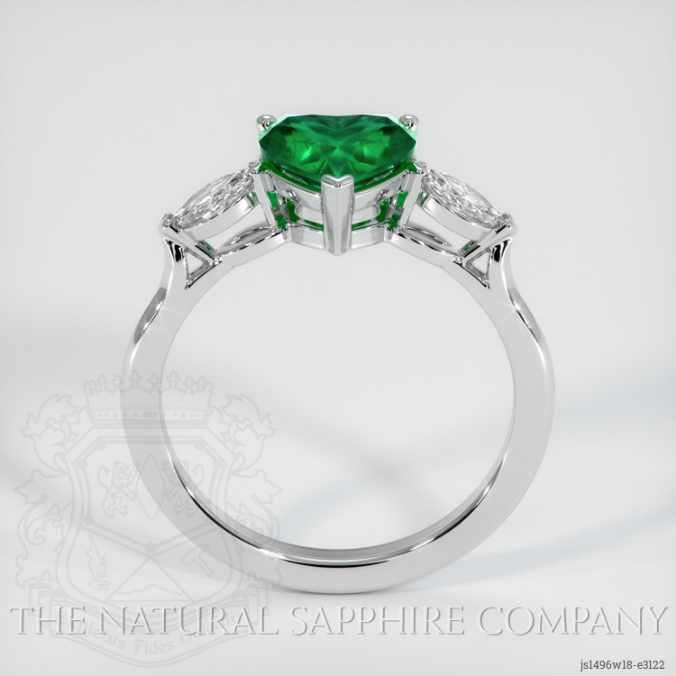 The ring features a beautiful, transparent 1.17 carat heart shape green emerald with the dimensions of 7.20 x 7.73 x 4.11 mm and a mixed brilliant cut. It has a clarity grade of very slightly included (evaluated at eye level), vivid color saturation, and an excellent polish. The origin of this emerald is Zambia.