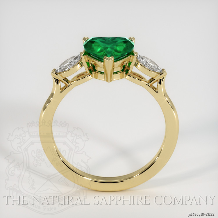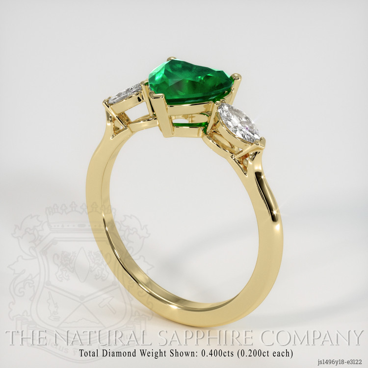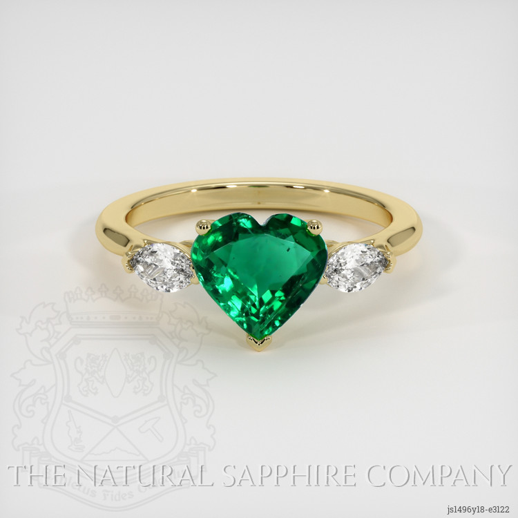 The ring features a beautiful, transparent 1.17 carat heart shape green emerald with the dimensions of 7.73 x 7.19 x 4.08 mm and a mixed brilliant cut. It has a clarity grade of very slightly included (evaluated at eye level), vivid color saturation, and an excellent polish. The origin of this emerald is Zambia.