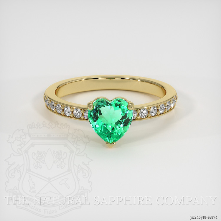The ring features a beautiful, transparent AGL certified 1.19 carat heart shape green emerald with the dimensions of 6.97 x 6.72 x 4.63 mm and a mixed brilliant cut. It has a clarity grade of eye clean (evaluated at eye level), intense color saturation, and an excellent polish. The origin of this emerald is Zambia.