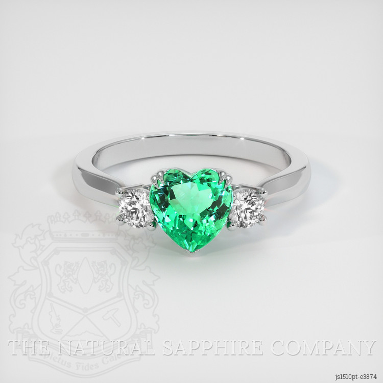 The ring features a beautiful, transparent AGL certified 1.19 carat heart shape green emerald with the dimensions of 6.97 x 6.72 x 4.63 mm and a mixed brilliant cut. It has a clarity grade of eye clean (evaluated at eye level), intense color saturation, and an excellent polish. The origin of this emerald is Zambia.