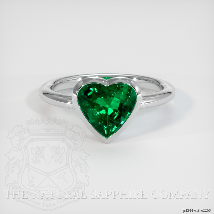 The ring features a beautiful, transparent 1.58 carat heart shape green emerald with the dimensions of 8.19 x 8.47 x 4.75 mm and a mixed brilliant cut. It has a clarity grade of very slightly included (evaluated at eye level), vivid color saturation, and an excellent polish. The origin of this emerald is Zambia.