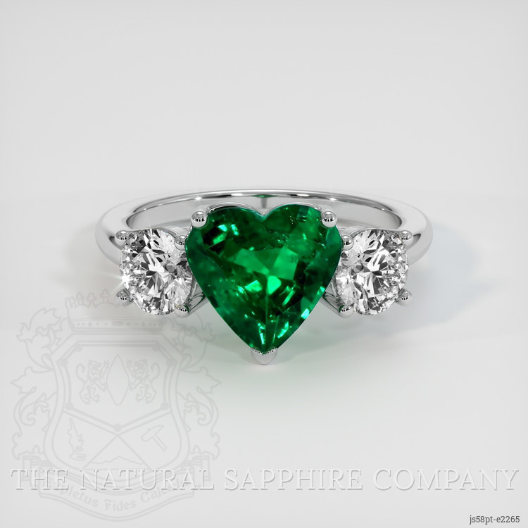 The ring features a beautiful, transparent 1.58 carat heart shape green emerald with the dimensions of 8.19 x 8.47 x 4.75 mm and a mixed brilliant cut. It has a clarity grade of very slightly included (evaluated at eye level), vivid color saturation, and an excellent polish. The origin of this emerald is Zambia.