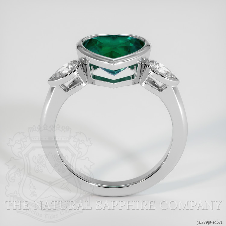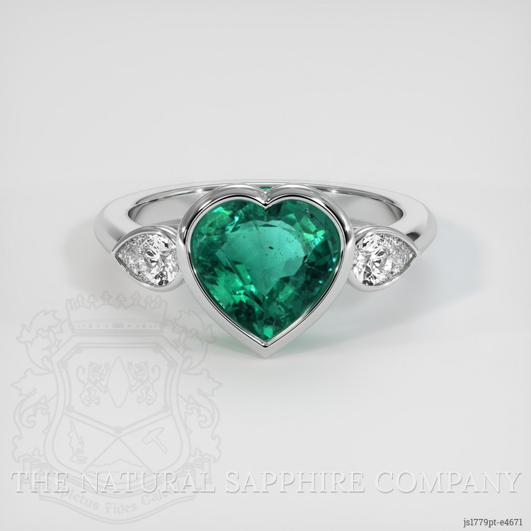 The ring features a beautiful, transparent 1.81 carat heart shape green emerald with the dimensions of 8.21 x 8.49 x 4.90 mm and a mixed brilliant cut. It has a clarity grade of very slightly included (evaluated at eye level), intense color saturation, and an excellent polish. The origin of this emerald is Zambia.