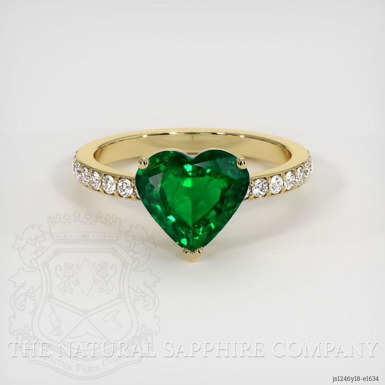 The ring features a beautiful, transparent 1.83 carat heart shape green emerald with the dimensions of 8.13 x 9.04 x 4.91 mm and a mixed brilliant cut. It has a clarity grade of very slightly included (evaluated at eye level), vivid color saturation, and an excellent polish. The origin of this emerald is Zambia.