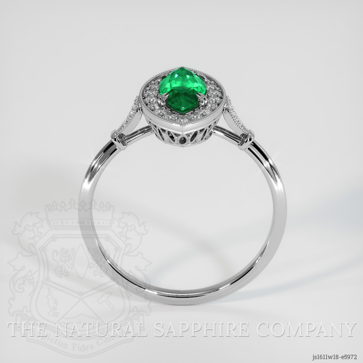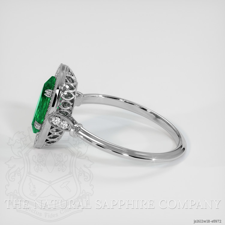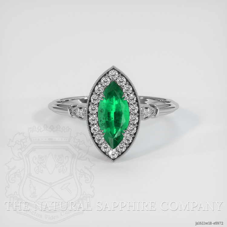 Surrounding the emerald are white round shaped diamonds, weighing approximately 0.27 carats and 0.072 carats, respectively. These diamonds hold a clarity grade of VS1/VS2 and feature a spectacular F color grade, perfectly harmonizing with the 18K white gold setting. The diamonds enhance the ring's radiance, offering a luxurious touch that distinguishes it from other options in the market. At The Natural Emerald Company, we pride ourselves on providing jewelry that combines meticulous craftsmanship with exceptional materials. This ring is a testament to that commitment, offering unparalleled quality and timeless elegance, making it an ideal piece for those who value uniqueness and history in their jewelry.