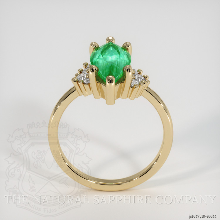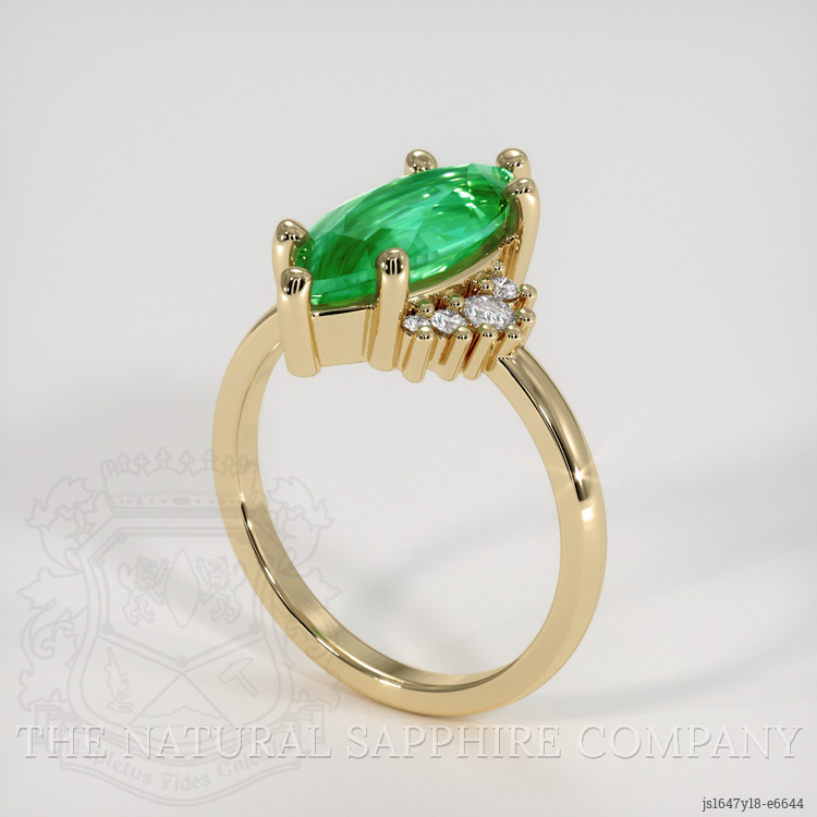 But the allure of this ring doesn't end with the emerald itself. Set in luxurious 18K yellow gold, the ring is accompanied by a cluster of white round-shaped natural diamonds. Strategically placed, these diamonds weigh a total of approximately 0.156 carats and possess a clarity grade of Very Slightly Included (VS1, VS2) with a pristine color grade of F. The choice of diamonds ensures a complementary sparkle that adds sophistication and elegance to the overall design. Each detail of this ring harmonizes beautifully, amplifying the natural beauty of the emerald and highlighting its exceptional color and clarity.