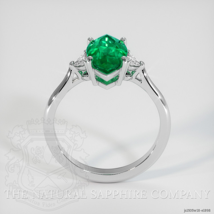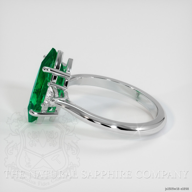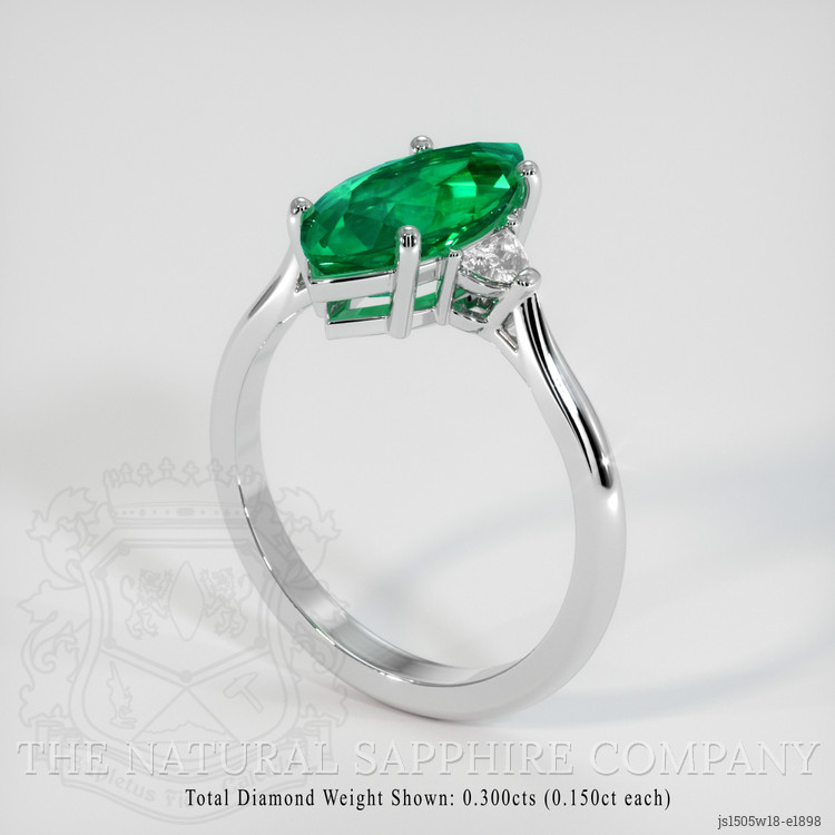 Encircling the resplendent emerald are exquisite white half moon shaped diamonds, their majestic shimmer akin to celestial crescents against a twilight sky. These diamonds weigh approximately 0.30 carats and hold a clarity grade of Very Slightly Included, crafted with meticulous care to possess an E color grade, rendering them a luminous counterpart to the emerald’s dazzle. The design achieves an exquisite harmony, where the gemstones are not mere adornments, but storytellers of love and timeless beauty, intertwining both opulence and subtlety.