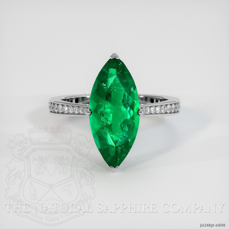 This ring showcases a finely proportioned marquise shape Colombian emerald weighing 2.97 carat, with dimensions 15.82 by 7.00 by 5.37 millimeters, cut in a mixed brilliant style to emphasize light return and internal fire. The marquise silhouette elongates the eye while offering an expansive surface for facet work, and the mixed brilliant cut combines the scintillating facets of a brilliant crown with a pavilion geometry optimized to channel light back through the table. Facet junctions are executed with care, and the excellent polish enhances the continuity of reflected light across the stone, producing broad flashes of vivid color and scintillation. The emerald is classified as slightly included at eye level, and its intense color saturation is the dominant visual attribute, while the standard enhancement is consistent with traditional treatments used to improve clarity without fundamentally altering the gem character.