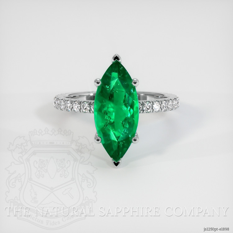 The ring features a beautiful, transparent 2.97 carat marquise shape green emerald with the dimensions of 15.82 x 7.00 x 5.37 mm and a mixed brilliant cut. It has a clarity grade of slightly included (evaluated at eye level), medium color saturation, and an excellent polish. The origin of this emerald is Colombia.