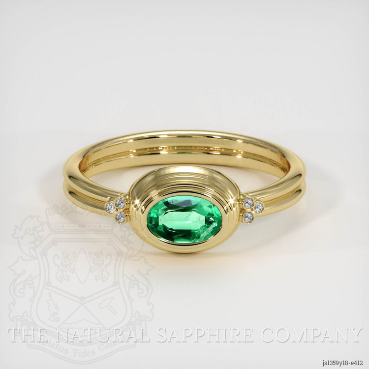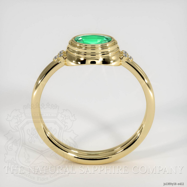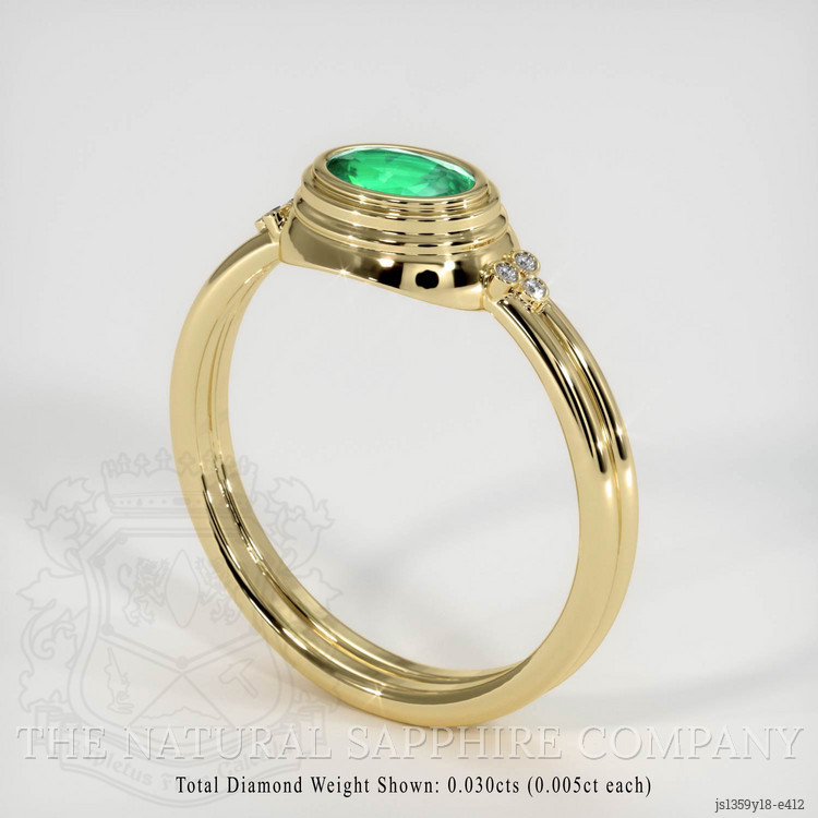 The ring features a beautiful, transparent 0.43 carat oval shape green emerald with the dimensions of 6.12 x 4.20 x 2.72 mm and a mixed brilliant cut. It has a clarity grade of very slightly included (evaluated at eye level), light color saturation, and an excellent polish. The origin of this emerald is Zambia.
