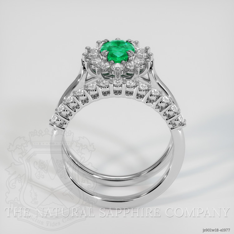 Set in the enduring elegance of 18K white gold, this treasure is accompanied by the shimmering allure of white diamonds. Surrounding the emerald are two collections of round shaped, natural diamonds, with a total weight of approximately 0.62 carats. Each diamond is rated within the very slightly included clarity grade and boasts an impressive color grade of F. The precision of their placement accentuates the ethereal beauty of the emerald, offering a stunning contrast that elevates the piece into a timeless work of art. The finish speaks to an opulence only allowable by the meticulous polishing each stone undergoes, an assurance of the exceptional standards held by The Natural Emerald Company.
