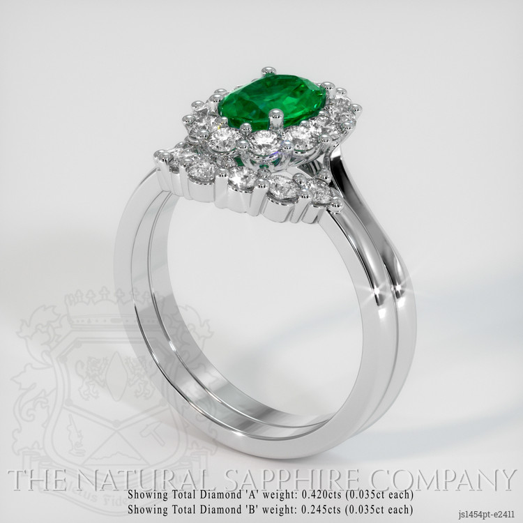The ring features a beautiful, transparent 0.62 carat oval shape green emerald with the dimensions of 7.19 x 5.17 x 2.46 mm and a mixed brilliant cut. It has a clarity grade of very slightly included (evaluated at eye level), intense color saturation, and an excellent polish. The origin of this emerald is Zambia.