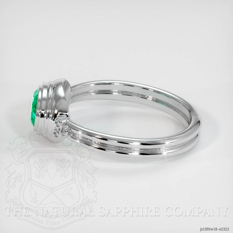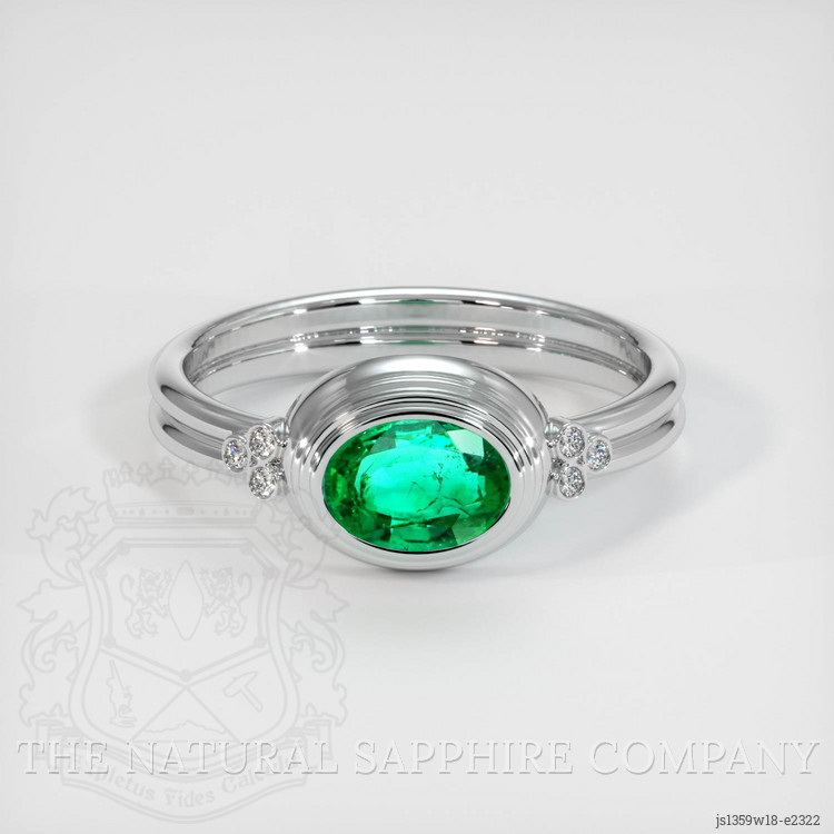 The ring features a beautiful, transparent 0.63 carat oval shape green emerald with the dimensions of 6.67 x 4.96 x 3.02 mm and a mixed brilliant cut. It has a clarity grade of slightly included (evaluated at eye level), medium color saturation, and an excellent polish. The origin of this emerald is Zambia.
