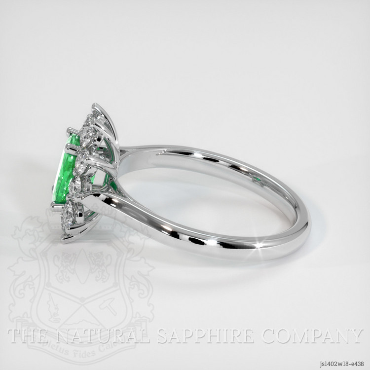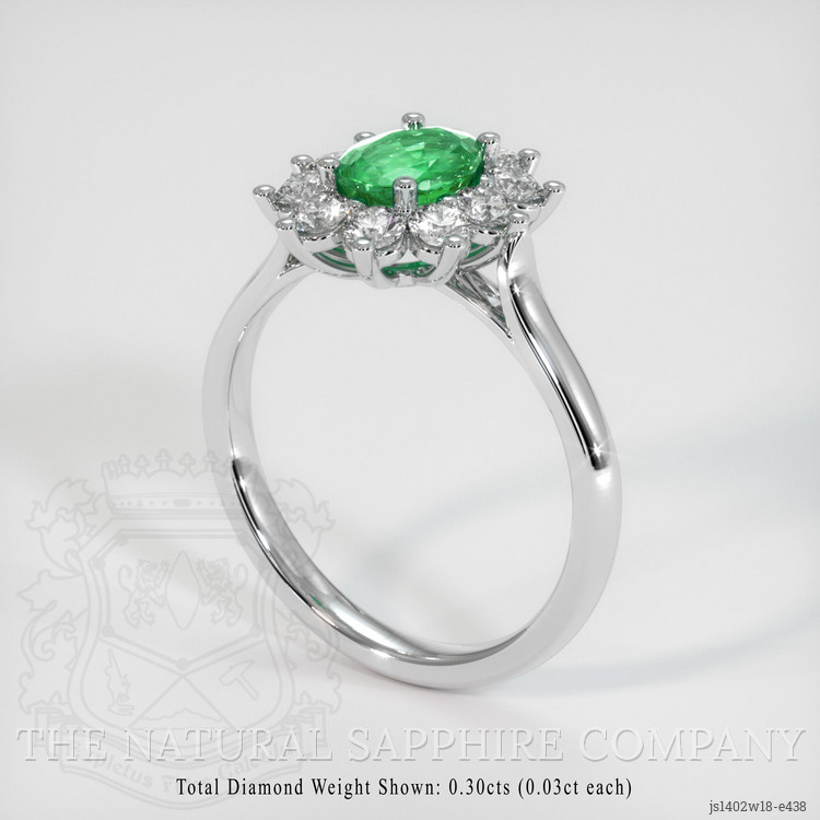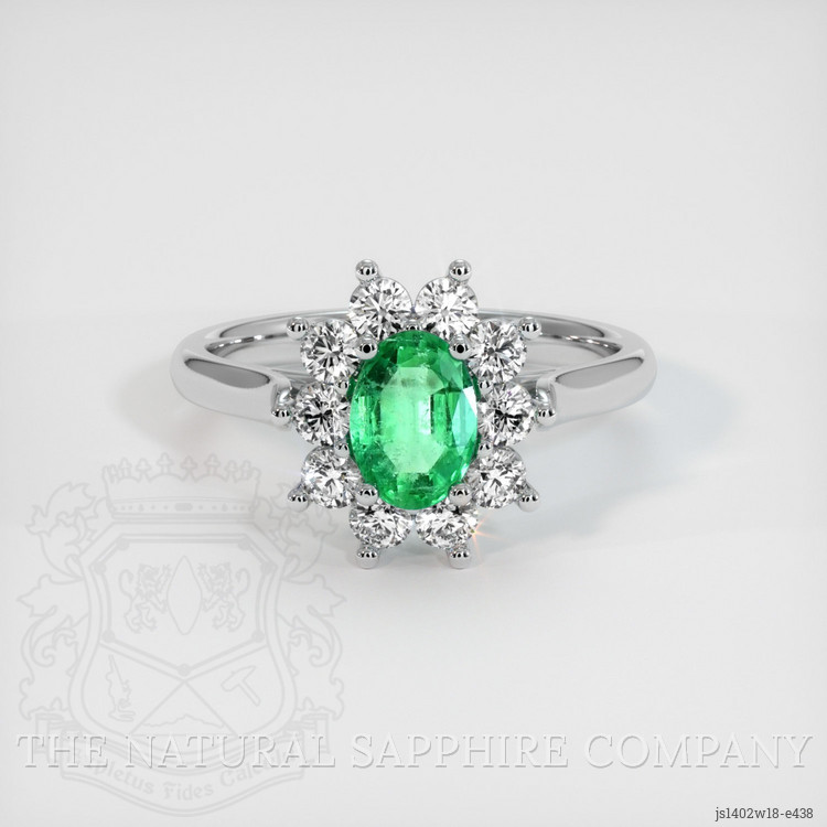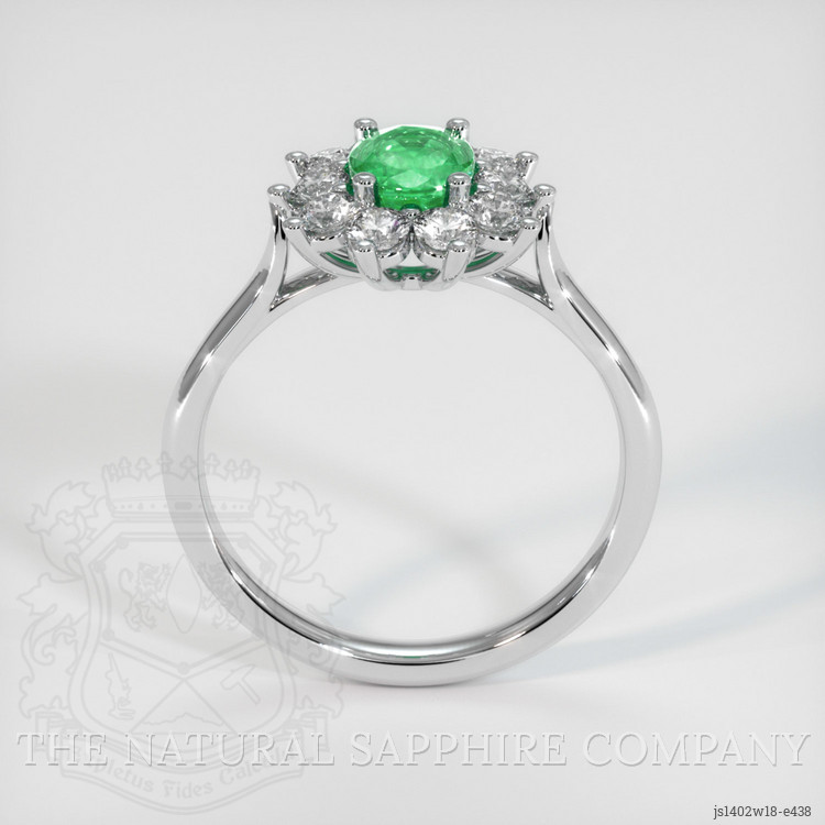 The ring features a beautiful, transparent 0.69 carat oval shape green emerald with the dimensions of 6.95 x 4.96 x 3.27 mm and a mixed brilliant cut. It has a clarity grade of slightly included (evaluated at eye level), light color saturation, and an excellent polish. The origin of this emerald is Zambia.