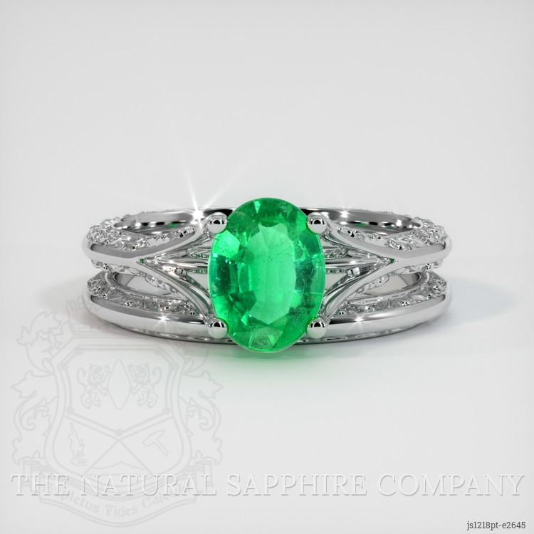The ring features a beautiful, transparent 0.99 carat oval shape green emerald with the dimensions of 8.06 x 6.13 x 3.49 mm and a mixed brilliant cut. It has a clarity grade of very slightly included (evaluated at eye level), intense color saturation, and an excellent polish. The origin of this emerald is Zambia.