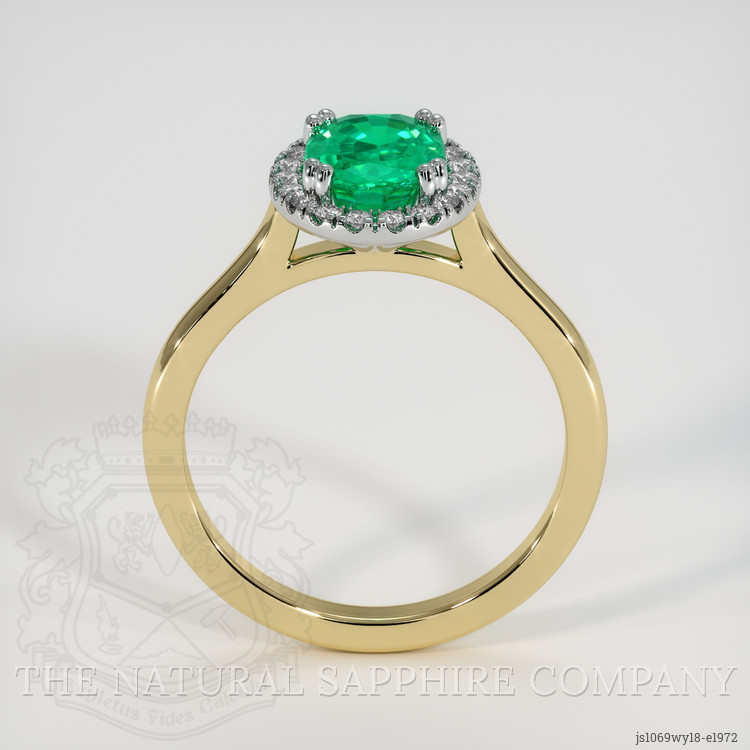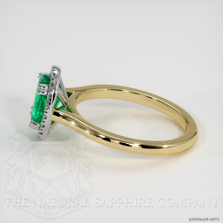 Enveloping this remarkable emerald are white round-shaped natural diamonds, a delicate accompaniment that enhances its rich green hue. Weighing approximately 0.23 carats with clarity graded at VS and a stunning color grade of F/G, these diamonds are a testament to purity and brilliance. Carefully selected and placed, they bring a harmonious balance to the ring, setting the stage for the emerald's starring role. The dual-tone of 18K white and yellow gold setting provides a versatile foundation, offering both contemporary flair and timeless elegance. This carefully crafted setting ensures that each element of the ring works in concert, producing a piece that is both intricate and cohesive.