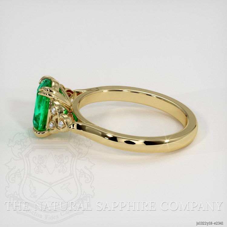 The ring's setting, crafted in the warmth of 18K yellow gold, cradles the emerald in a manner that complements its natural beauty. Surrounding the center stone, exquisitely placed white round natural diamonds enhance its grandeur. These diamonds, weighing approximately 0.045 carats, possess a clarity grade of Very Slightly Included (VS1, VS2) and a color grade of F, promising not only excellence but also a breathtaking sparkle. These elements come together in harmonious synergy, creating an emotional connection that touches the heart of its wearer and mirror the moments of love and joy in life.