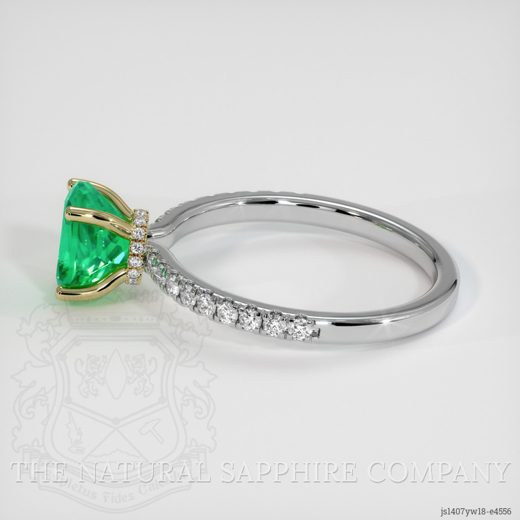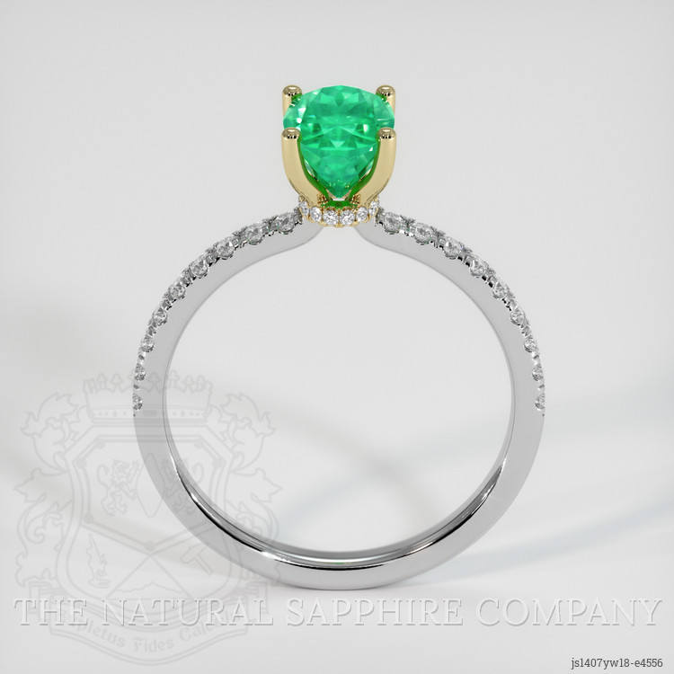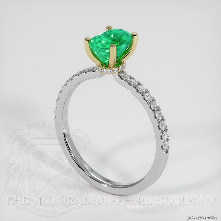 The emerald is cradled by an elegant setting of white and yellow 18K gold, harmoniously blending with the fine intricacies below. A parade of white round-shaped natural diamonds accompanies it, weighing approximately 0.30 carats with an additional delicate array totaling 0.065 carats. With a clarity of VS and a color grade of F/G, these diamonds dance with an internal fire, each facet carefully chosen to amplify the unparalleled beauty of their emerald counterpart. Together they inspire a striking balance of elegance and grandeur, a testimony to decades of expert craftsmanship honored by The Natural Emerald Company.