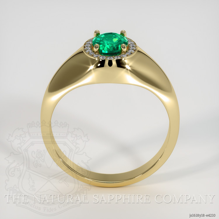 This men's ring resolves the quest for unparalleled gemstone beauty and exceptional craftsmanship, bringing together a dazzling emerald surrounded by pristine diamonds and set in opulent 18K yellow gold, making it a radiant choice that meets and exceeds expectations.