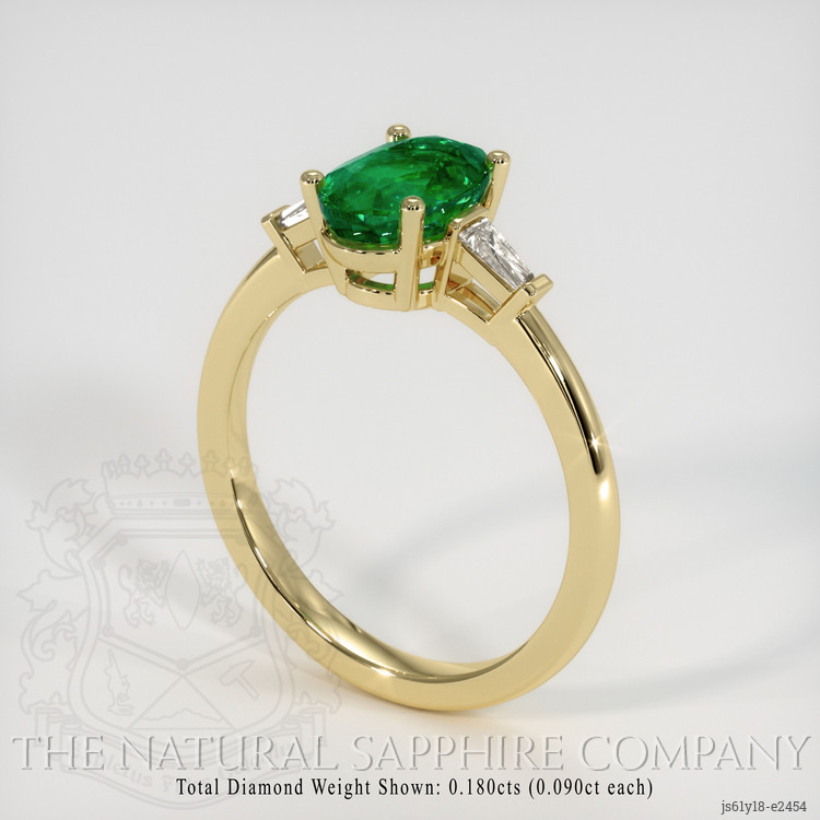 The ring features a beautiful, transparent 1.21 carat oval shape green emerald with the dimensions of 8.31 x 5.84 x 4.05 mm and a mixed brilliant cut. It has a clarity grade of slightly included (evaluated at eye level), vivid color saturation, and an excellent polish. The origin of this emerald is Zambia.
