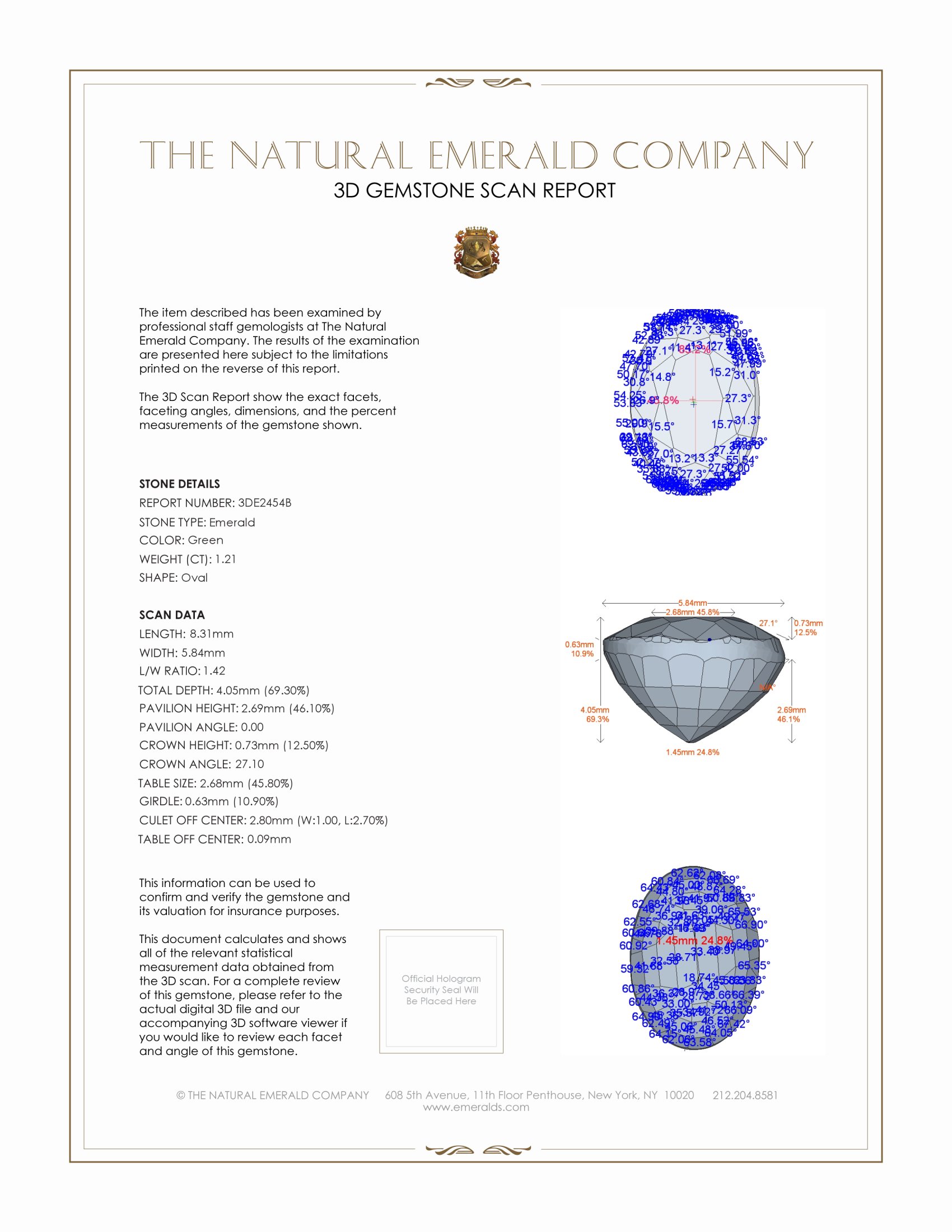 The ring features a beautiful, transparent 1.21 carat oval shape green emerald with the dimensions of 8.31 x 5.84 x 4.05 mm and a mixed brilliant cut. It has a clarity grade of slightly included (evaluated at eye level), vivid color saturation, and an excellent polish. The origin of this emerald is Zambia.