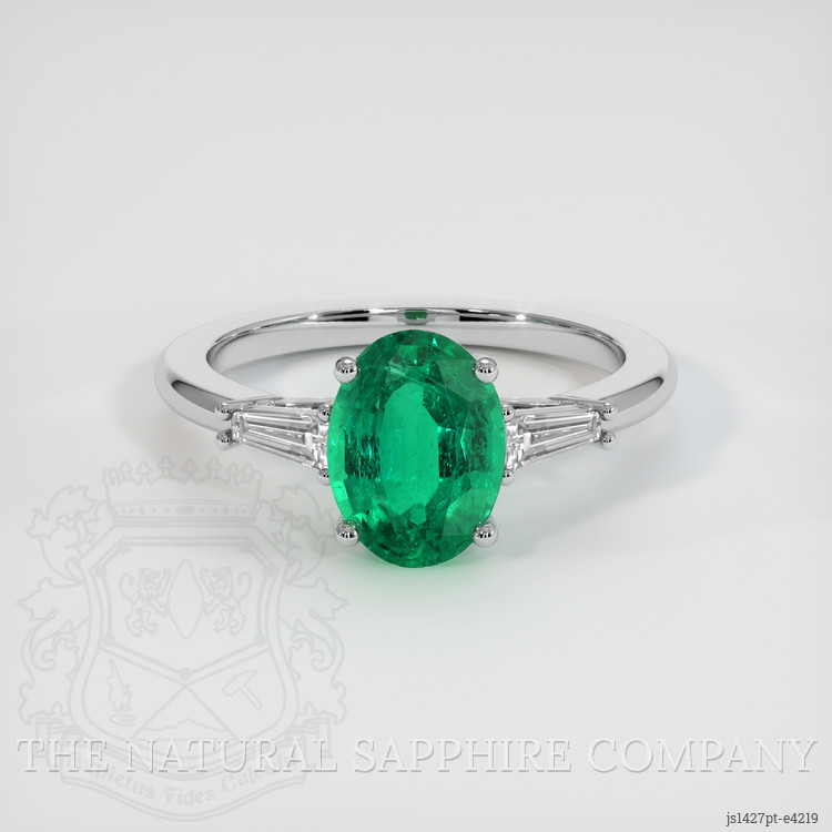 Set in platinum 950, the durability and sheen of this precious metal serve as a perfect companion to the emerald's vivid hue. The ring features refined baguette-shaped white diamonds strategically placed on either side of the central stone. These diamonds add a classic touch with a combined weight of approximately 0.28 carats. Their exquisite clarity, graded as VS1 to VS2, along with a color grade of E, guarantees a pristine brilliance that enhances the emerald's beauty. The combination of these high-quality stones with the luxurious platinum setting makes the ring not only visually stunning but also robust enough to withstand the passage of time.