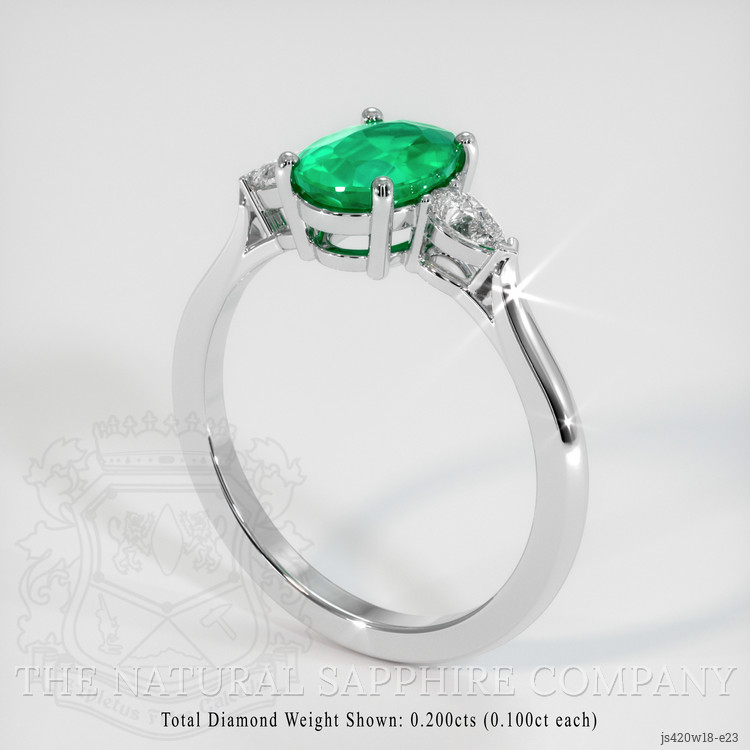 The ring features a beautiful, transparent 1.34 carat oval shape green emerald with the dimensions of 8.07 x 6.04 x 4.56 mm and a mixed brilliant cut. It has a clarity grade of slightly included (evaluated at eye level), light color saturation, and an excellent polish. The origin of this emerald is Zambia.