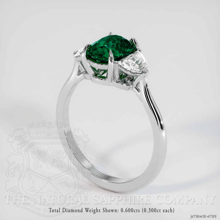 Accompanying this rare gem are white half moon shaped lab-grown diamonds, adding a sophisticated complement to the centerpiece. Weighing approximately 0.60 carats in total, each diamond embodies an elegant VS1, VS2 clarity combined with an exquisite color grade of E. The harmony between the vibrant green emerald and the pristine white diamonds creates a piece that is both classic and contemporary. Set entirely in luminous 18K white gold, the ring exudes luxury and sophistication, designed for those who cherish uniqueness and unparalleled beauty.