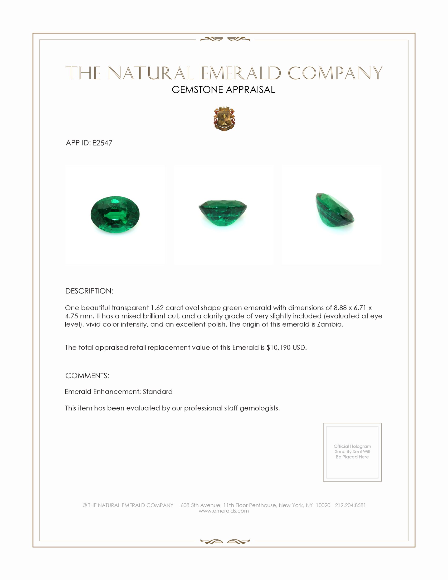 The men's ring features a beautiful, transparent 1.62 carat oval shape green emerald with the dimensions of 8.88 x 6.71 x 4.75 mm and a mixed brilliant cut. It has a clarity grade of very slightly included (evaluated at eye level), vivid color saturation, and an excellent polish. The origin of this emerald is Zambia.