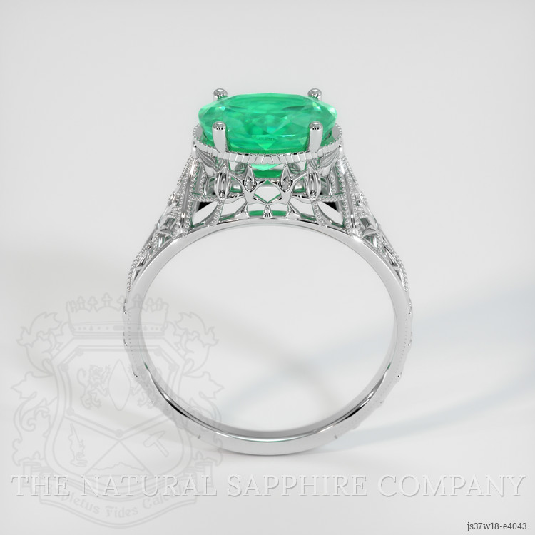 The ring features a beautiful, transparent 1.64 carat oval shape green emerald with the dimensions of 9.06 x 6.86 x 4.70 mm and a mixed brilliant cut. It has a clarity grade of very slightly included (evaluated at eye level), medium color saturation, and an excellent polish. The origin of this emerald is Colombia.