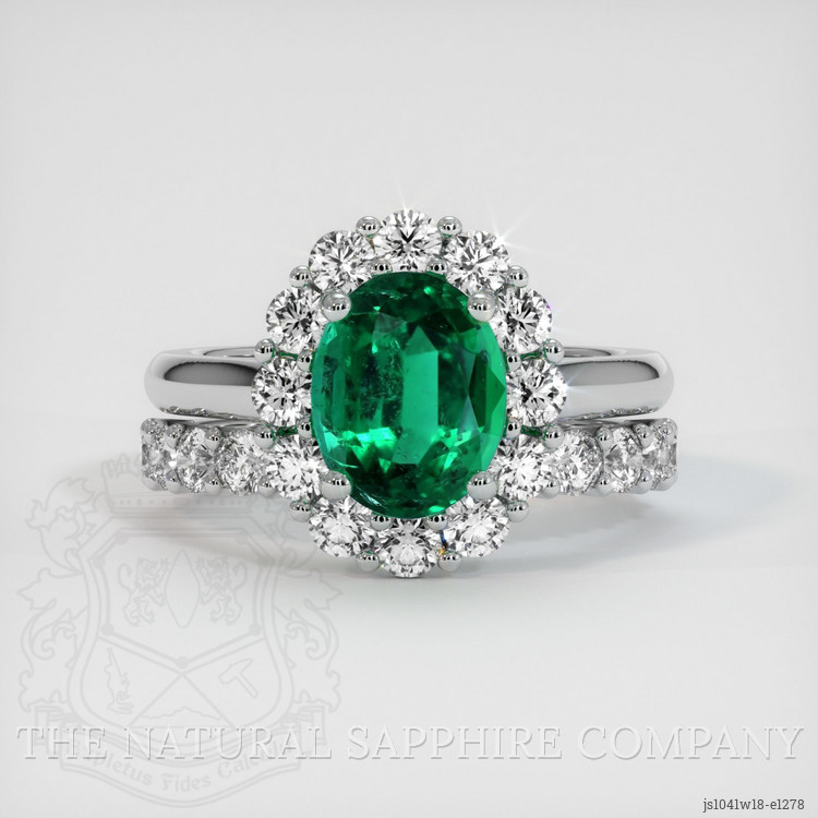 The ring features a beautiful, transparent 1.84 carat oval shape green emerald with the dimensions of 8.77 x 7.02 x 5.07 mm and a mixed brilliant cut. It has a clarity grade of very slightly included (evaluated at eye level), vivid color saturation, and an excellent polish. The origin of this emerald is Zambia.