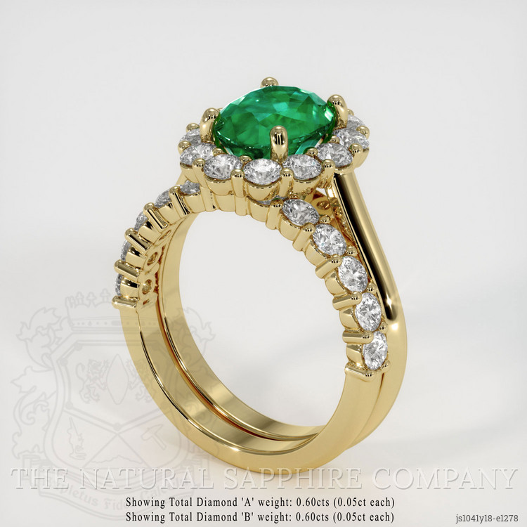 The ring features a beautiful, transparent 1.84 carat oval shape green emerald with the dimensions of 8.77 x 7.02 x 5.07 mm and a mixed brilliant cut. It has a clarity grade of very slightly included (evaluated at eye level), vivid color saturation, and an excellent polish. The origin of this emerald is Zambia.