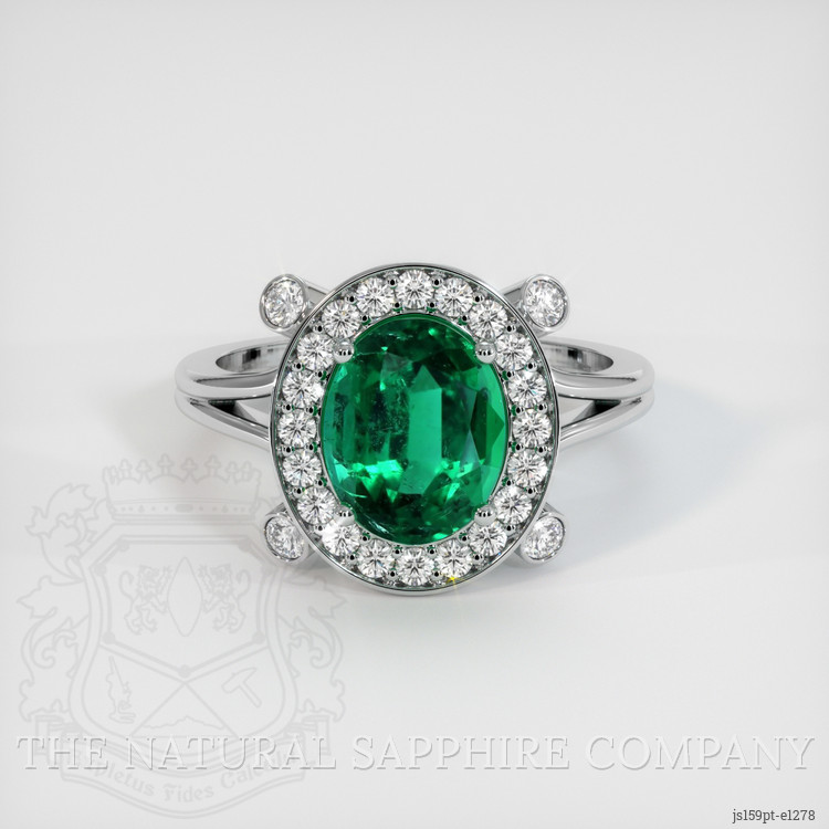 The ring features a beautiful, transparent 1.84 carat oval shape green emerald with the dimensions of 8.77 x 7.02 x 5.07 mm and a mixed brilliant cut. It has a clarity grade of very very slightly included (evaluated at eye level), vivid color saturation, and an excellent polish. The origin of this emerald is Zambia.