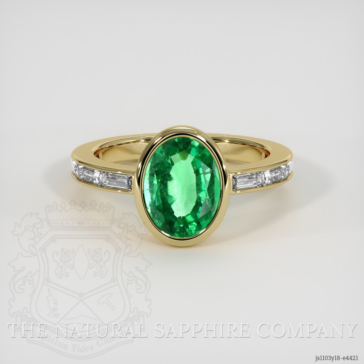 In the world of romance and eternal promises, the ring crafted by The Natural Emerald Company blooms like the heart of nature encapsulated in golden elegance. The focal point is a breathtaking 1.92 carat emerald, an oval green gem that captures the springtime whispers of Zambia with its vibrant allure. Measuring 9.73 by 7.33 by 4.56 millimeters, this emerald is adorned with a mixed brilliant cut that reflects light like the shimmering surface of a tranquil lake. Its clarity reveals an almost untouched purity, whispering softly of dreams yet to unfold, while its intense color saturation invites endless admiration, stirring emotions akin to the first sigh of love.