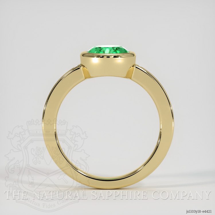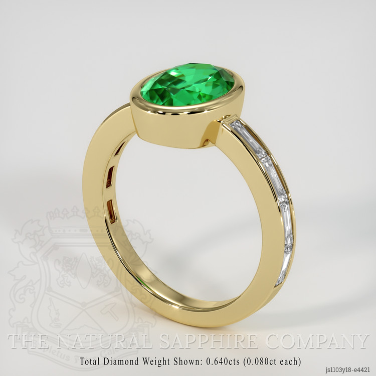 The gentle embrace of 18K yellow gold cradles this green marvel, creating a harmonious bond between earth and the divine. Each curve of the band, meticulously smoothed, promises a caress that ensures comfort for everyday wear. Two white baguette diamonds, with a combined weight of 0.64 carats, frame the emerald like silent guardians. Their sparkling purity, rated as very slightly included with a clarity of VS1 and VS2, dances alongside the soft glow of the gold, creating a symphony of light and love that speaks directly to the heart.