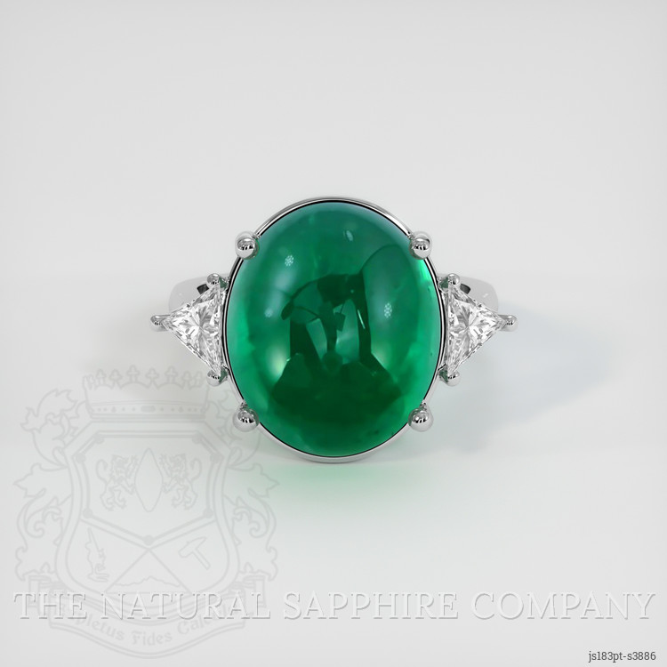 Flanking this regal center are white trillion shaped natural diamonds, weighing approximately 0.60 carats in total, their clarity graded Very Slightly Included VS1, VS2 and their color graded E, each facet cut to catch and return light in a steady, confident flash. The diamonds are set with surgical precision, their triangular profiles and crisp edges creating a modern companion to the emeralds soft dome, a harmonious balance between bold color and icy brilliance. The entire ring is rendered in platinum 950, a metal chosen for its enduring strength and cool luminescence, a fitting stage for a gem that will be passed down and cherished. When you wear this ring you do not simply wear jewelry, you wear the dedication of gem cutters and setters who refined every line, every angle, every reflection until the piece spoke with clarity and emotion. Let this ring from The Natural Emerald Company be the embrace that marks a proposal, the anniversary gift that rekindles devotion, the heirloom that tells of love across generations, a crafted gem that promises to become a beloved keeper of your most cherished moments.