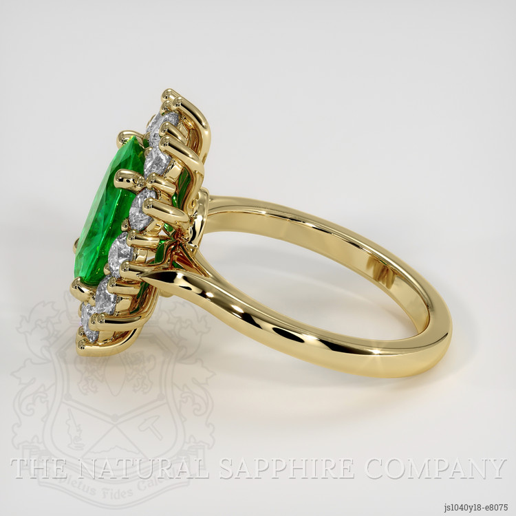 The entire composition is set in rich 18K yellow gold, adding a warm radiance that enhances the natural beauty of both the emerald and diamonds. Its elegant band is polished to perfection, offering smoothness that ensures comfortable daily wear. The design ensures that the ring not only serves as a magnificent statement piece but also as a wearable treasure fit for every occasion. The smooth band is thoughtfully crafted for seamless integration with your daily style, providing luxury without compromising comfort.