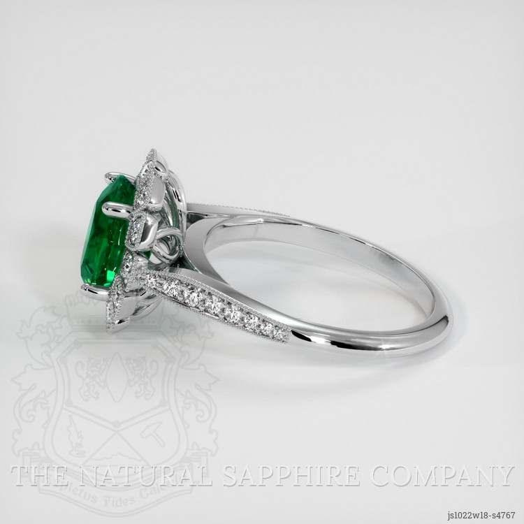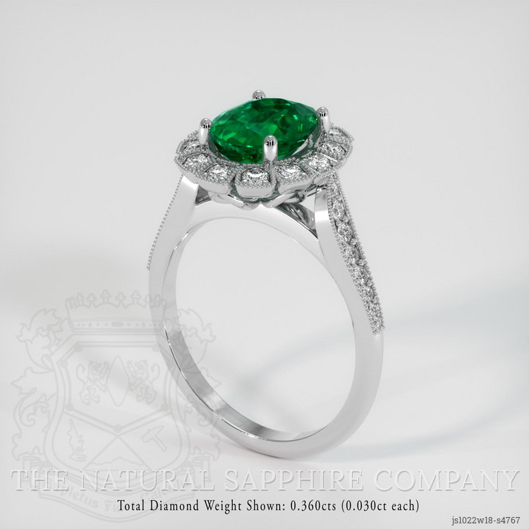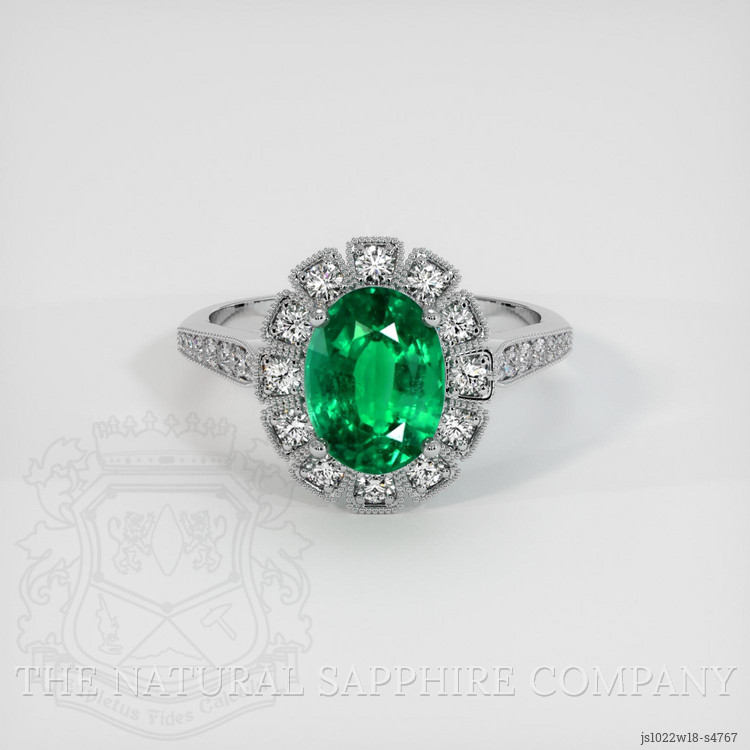 The ring features a beautiful, transparent 2.08 carat oval shape green emerald with the dimensions of 9.62 x 7.22 x 5.00 mm and a mixed brilliant cut. It has a clarity grade of very slightly included (evaluated at eye level), vivid color saturation, and an excellent polish. The origin of this emerald is Zambia.