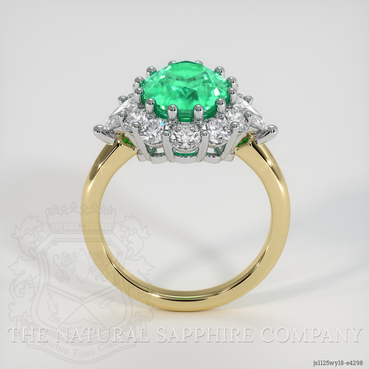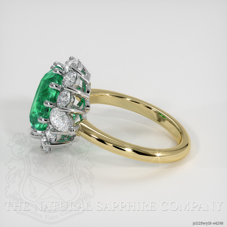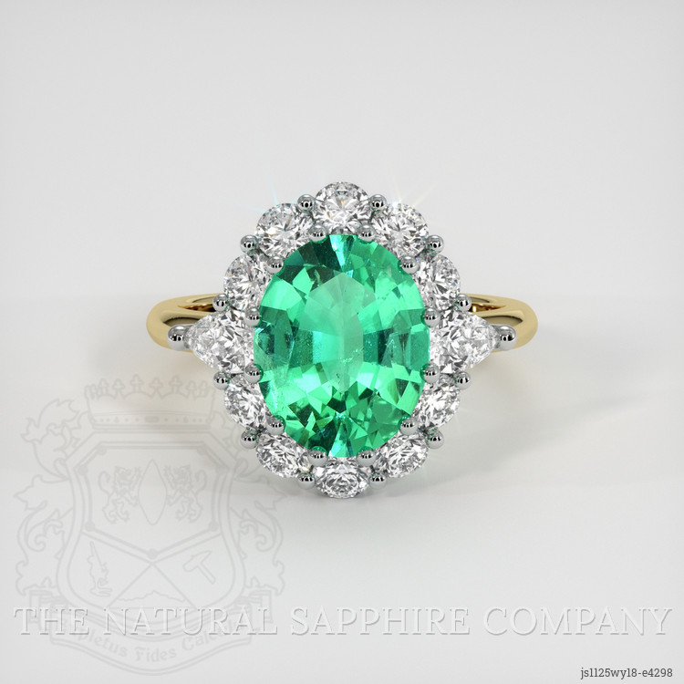 The construction of the ring places emphasis on longevity and refinement, with work that reflects the standards of The Natural Emerald Company. The mixed brilliant cut of the emerald distributes sparkle across the surface while preserving the depth of its medium intense green, and the excellent polish ensures clean facet junctions and crisp reflections. The white gold head and prongs provide a neutral backdrop to the diamonds and reduce visual color influence on the emerald, while the yellow gold shank contributes resilience and a timeless warmth that will patinate gracefully with wear. The pear shaped diamonds at the shoulders are positioned to offer a measured transition from the central oval, creating visual balance and a silhouette that reads as both elegant and substantial. Each diamond is selected for complementary color and clarity, ensuring a cohesive appearance under varied lighting, and the standard enhancement applied to the emerald follows established gemological practice to stabilize surface reaching fissures and to preserve the stone for everyday wear.